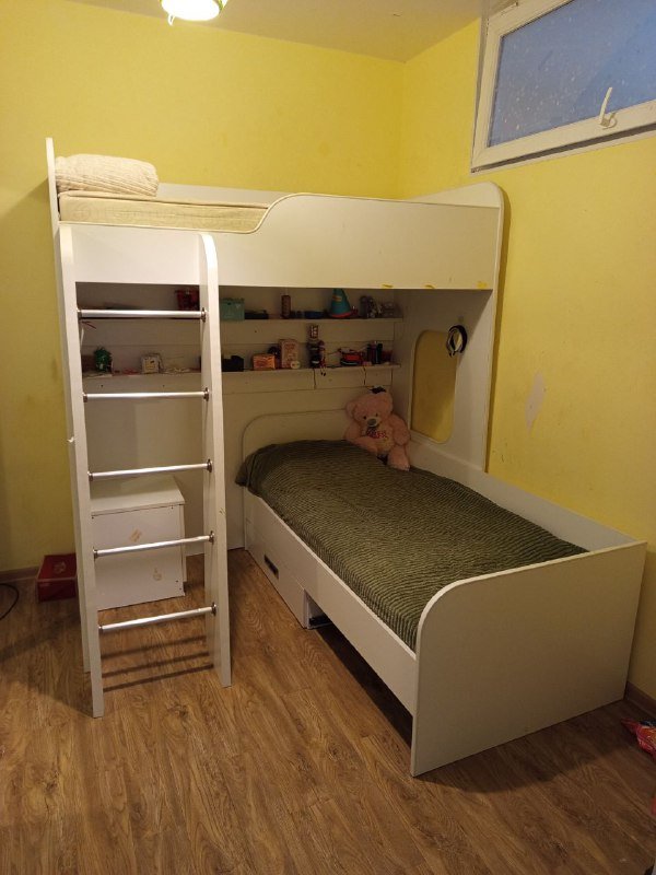 Удобство и экономия места:** идеальное решение для небольшой комнаты. Нижний ярус полностью выдвигается, превращаясь в полноценное спальное место, а в собранном виде выглядит как компактная кровать. Состояние отличное, почти новое.