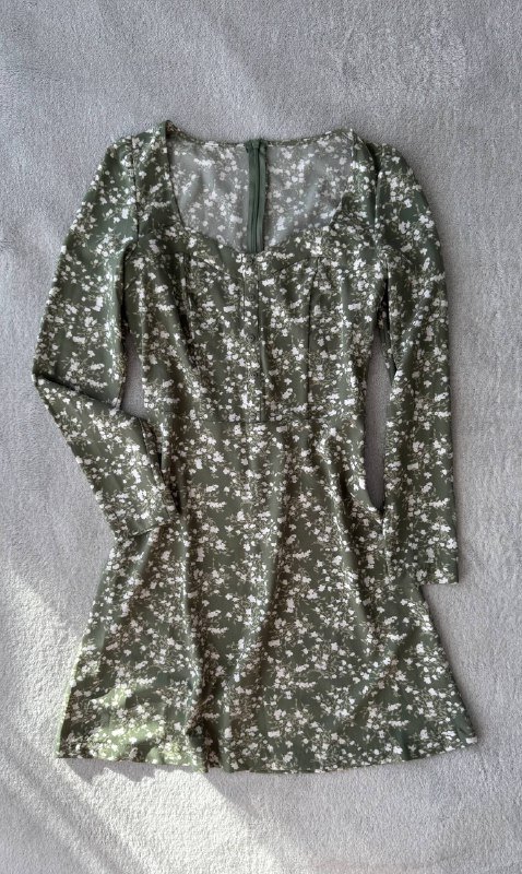 С круглым вырезом на спине (на фото вид сзади). Длина мини. Цвет серебристо-зеленоватый. Размер S-M. Цена 25 лари.