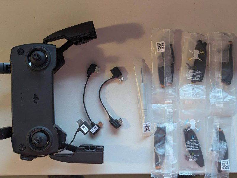 Сумка, пульт, три батареи и станция к ним, запасные лопасти.