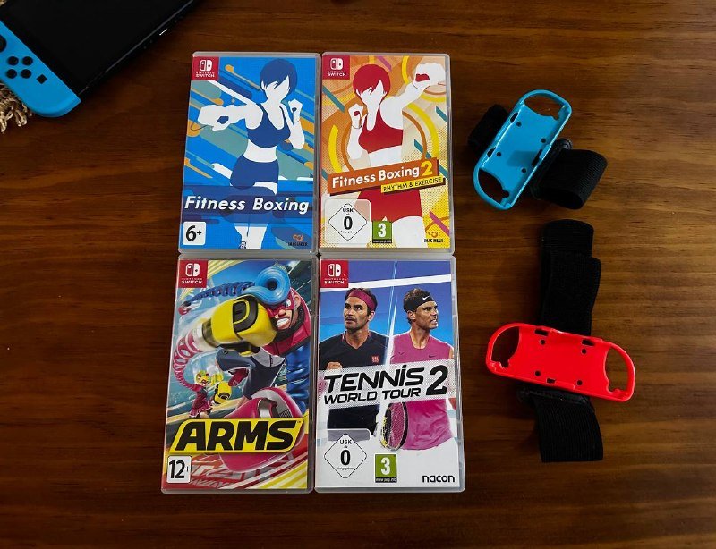Комплект: консоль, зарядное устройство, карта памяти, док станция, держатель для джойконов, накладки на джойконы и чехол.
