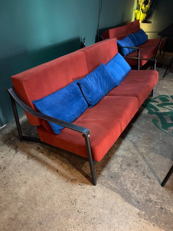 Стильный диван терракотовый с синими подушками