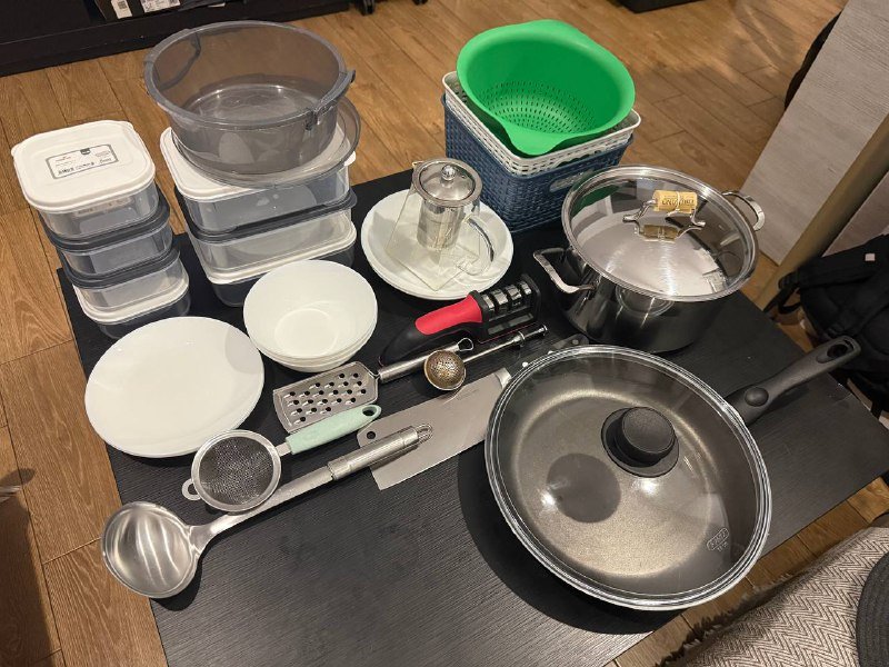 Контейнеры, тарелки, чайник, ситечки, точилка, терка, поварешка, тисак, корзинки, дуршлаг, кастрюля, сковородка