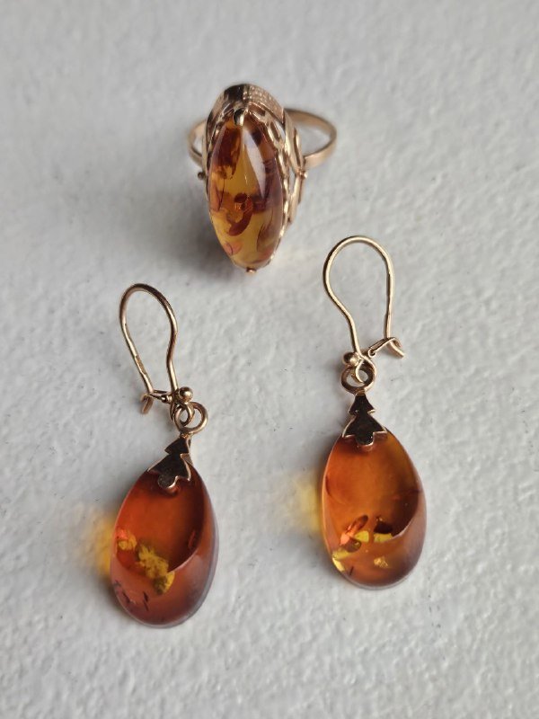 Золотой комплект с янтарем, серебряные кольца с натуральными камнями