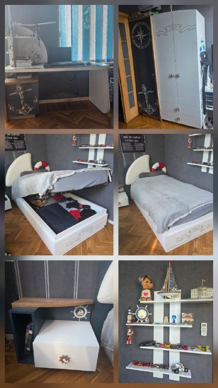 Спальный гарнитур: кровать, стол, тумба, шкаф, полки