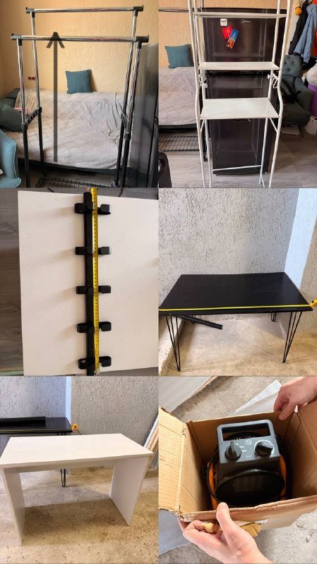 Вешалка напольная, полка металлическая, столы, тепловая пушка